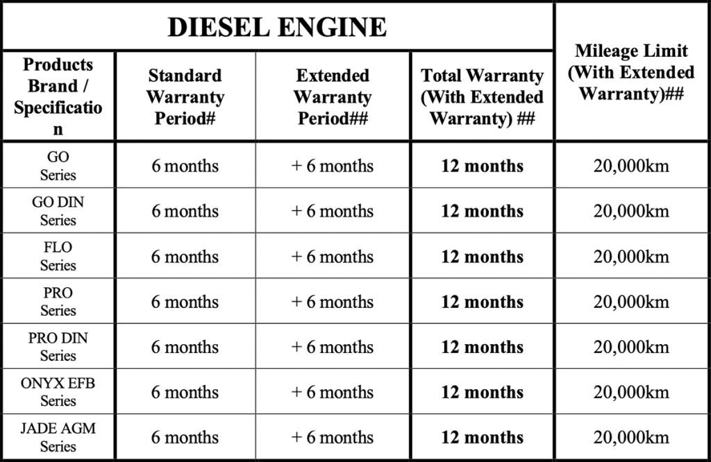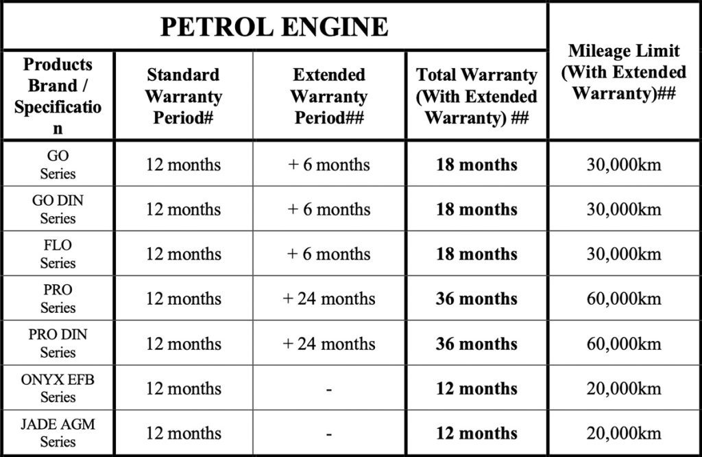 All AMARON batteries come with a warranty. The coverage duration varies by battery specification and vehicle engine type. Below are the warranty periods: